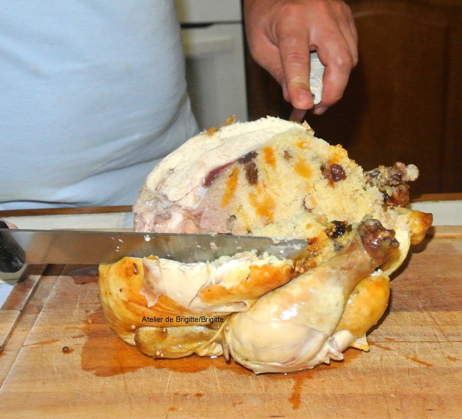Poulet Farci Au Couscous - poulet-farci-au-couscous-26-batbout-2878-29 - Sousoukitchen / Bien mélanger et farcir la volaille.. Mélangez tous les ingrédients dans un plat. En faire une farce parfumée il faut un gros poulet, du couscous roulé, des raisins secs des amandes effilées et des aromates. Une fois bien rôti, ajouter les oignons émincés. Retirer les deux os des cuisses par l'intérieur, sans inciser la chair. Réservez à température ambiante en retournant le poulet de temps en temps.
